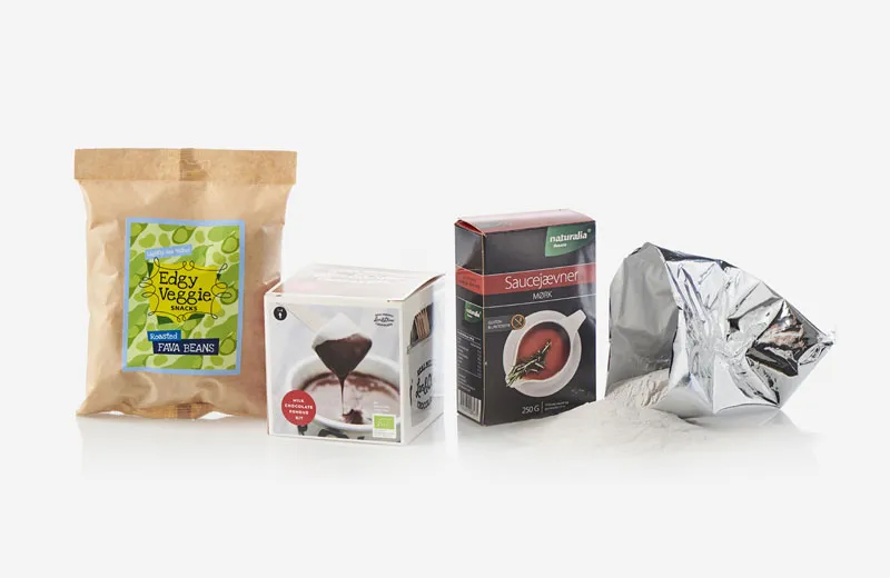 Krydderier, pulver, gær, kosttilskud m.m. kan fyldes i sachetter fra 1 g til 100 g til produktpromovering og lignende.